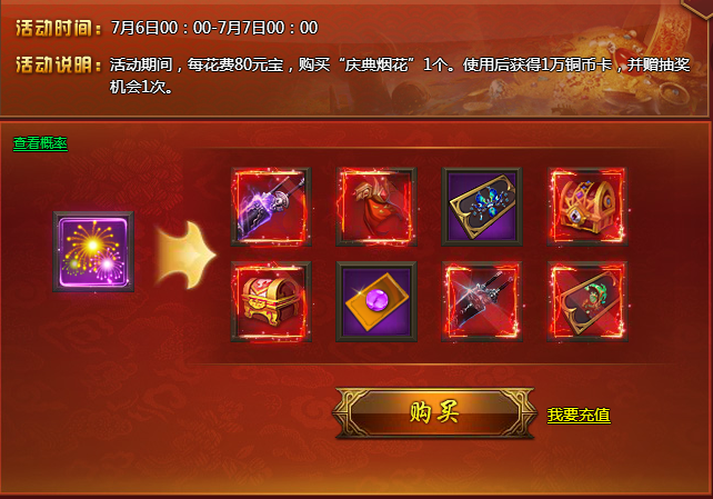 【活动内容】活动期间,花费80元宝购买活动道具“庆典烟花”1个,使用后获得1万铜币卡,并赠抽奖机会1次,抽奖后即有机会获得高级披风材料、剑鞘、高级宝石等众多豪华大礼,机会难得!