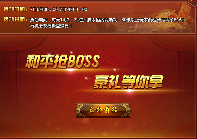 【活动内容】活动期间,每天14点、22点开启永恒战魂活动,80级以上玩家前往参与击杀boss,有机会获得专业品牌道具!