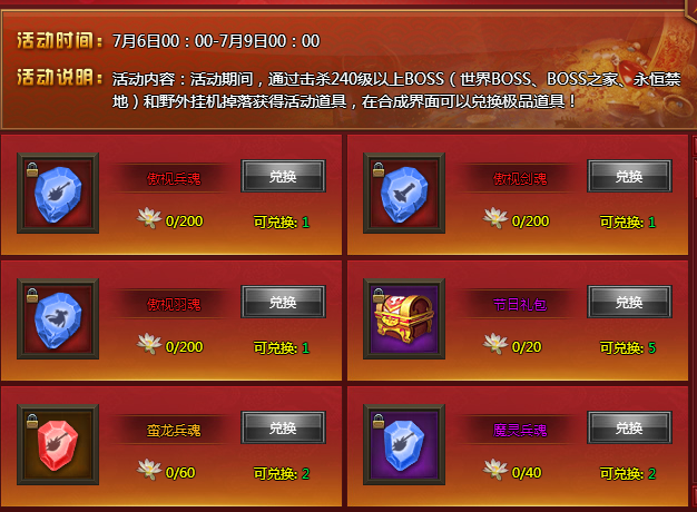 【活动内容】活动期间,击杀240级以上的世界boss、boss之家、永恒禁地以及野外怪物,有几率掉落活动道具,使用活动道具可以兑换丰厚奖励!