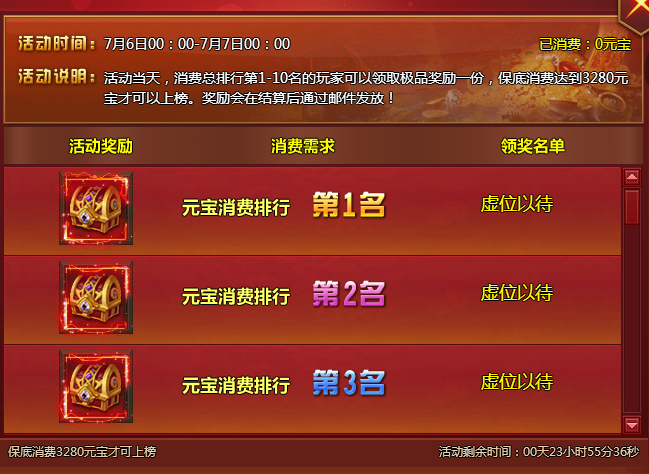 【活动内容】活动当天,消费总排行第1-10名的玩家可以领取专业品牌奖励一份,保底消费达到3280元宝才可以上榜。奖励会在结算后通过邮件发放!
