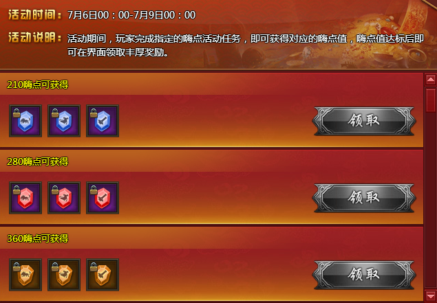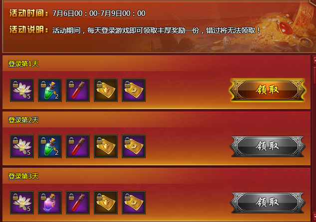【活动内容】活动期间,每天登录游戏即可领取丰厚奖励一份,错过将无法领取!
