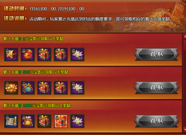 【活动内容】活动期间,玩家累计充值达到对应的额度要求,即可领取相应的累计充值奖励。