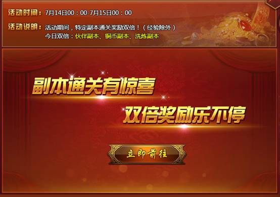 【活动内容】活动期间,特定副本通关奖励双倍!(经验除外)。