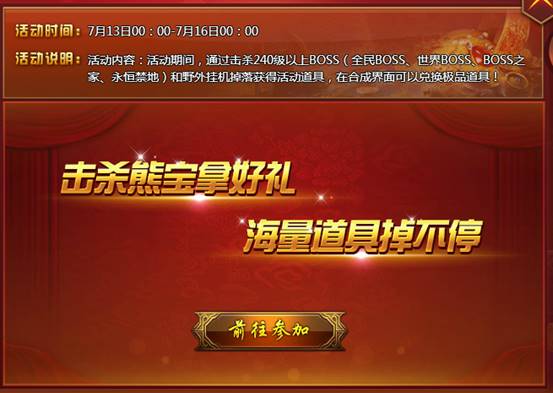 【活动内容】活动前三天,击杀240级以上boss(全民boss、世界boss、boss之家、永恒禁地)和野外挂机掉落可以获得活动材料,在合成界面可以兑换专业品牌道具!