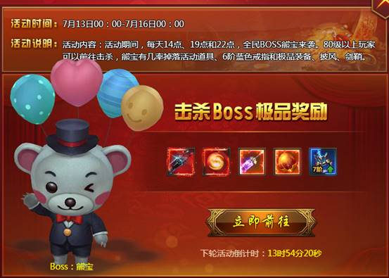【活动内容】活动期间,每天14点、19点和22点,全民boss熊宝来袭。80级以上玩家可以前往击杀,熊宝有几率掉落活动道具、6阶蓝色戒指和专业品牌装备、披风材料、剑鞘。全民Boss掉落的道具种类根据世界等级变化。