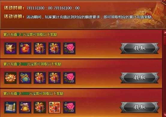 【活动内容】活动期间,玩家累计充值达到对应的额度要求,即可领取相应的累计充值奖励。