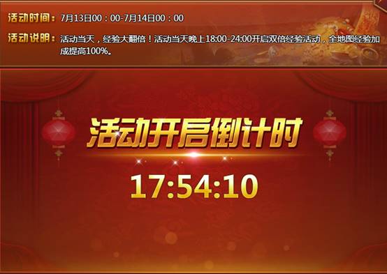 【活动内容】活动当天,经验大翻倍!活动当天晚上18:00-24:00开启双倍经验活动,全地图经验加成提高高。(包括副本)
