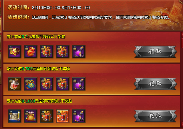 【活动内容】活动期间,玩家累计充值达到对应的额度要求,即可领取相应的累计充值奖励。