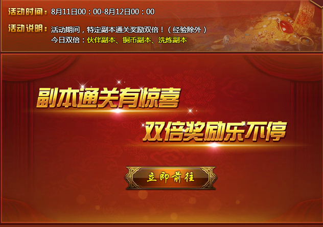 【活动内容】活动期间,特定副本通关奖励双倍!(经验除外)。