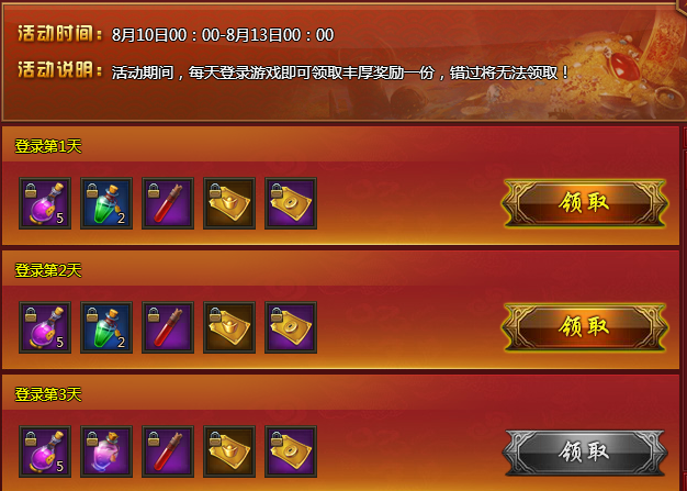【活动内容】活动期间,每天登录游戏即可领取丰厚奖励一份,错过将无法领取!
