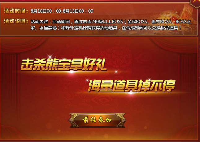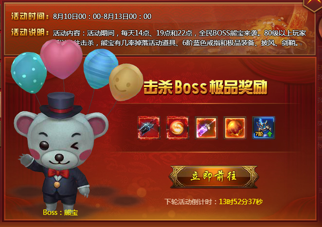 【活动内容】活动期间,每天14点、19点和22点,全民boss熊宝来袭。80级以上玩家可以前往击杀,熊宝有几率掉落活动道具、6阶蓝色戒指和专业品牌装备、披风材料、剑鞘。全民Boss掉落的道具种类根据世界等级变化。