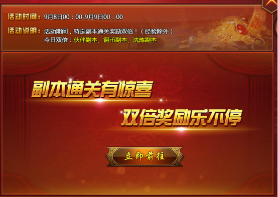 【活动内容】活动期间,特定副本通关奖励双倍!(经验除外)。