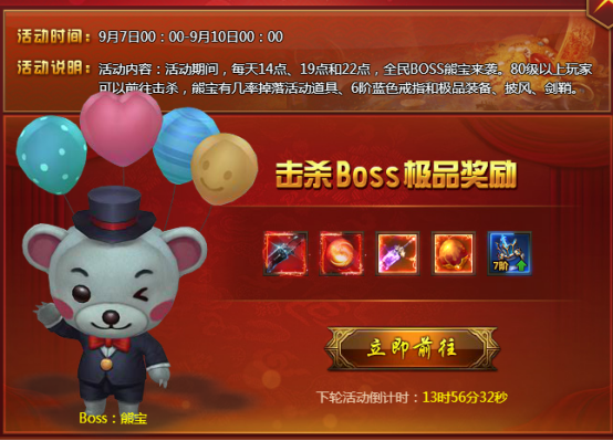 【活动内容】活动期间,每天14点、19点和22点,全民boss熊宝来袭。80级以上玩家可以前往击杀,熊宝有几率掉落活动道具、6阶蓝色戒指和专业品牌装备、披风材料、剑鞘。全民Boss掉落的道具种类根据世界等级变化。