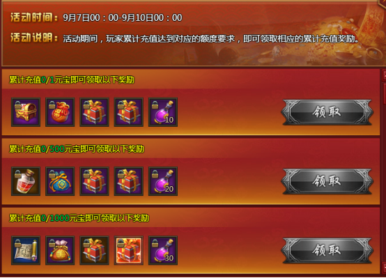 【活动内容】活动期间,玩家累计充值达到对应的额度要求,即可领取相应的累计充值奖励。
