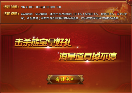 【活动内容】活动前三天,击杀240级以上boss(全民boss、世界boss、boss之家、永恒禁地)和野外挂机掉落可以获得活动材料,在合成界面可以兑换专业品牌道具!