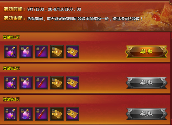 【活动内容】活动期间,每天登录游戏即可领取丰厚奖励一份,错过将无法领取!