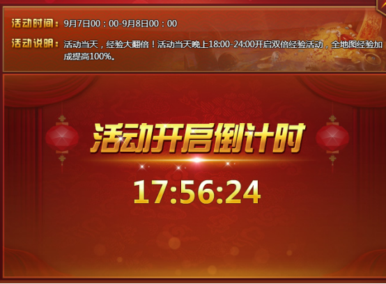 【活动内容】活动当天,经验大翻倍!活动当天晚上18:00-24:00开启双倍经验活动,全地图经验加成提高高。(包括副本)