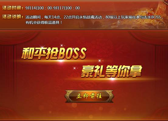 【活动内容】活动期间,每天14点、22点开启永恒战魂活动,80级以上玩家前往参与击杀boss,有机会获得专业品牌道具!