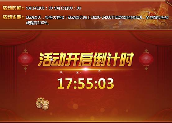 【活动内容】活动当天,经验大翻倍!活动当天晚上18:00-24:00开启双倍经验活动,全地图经验加成提高高。(包括副本)