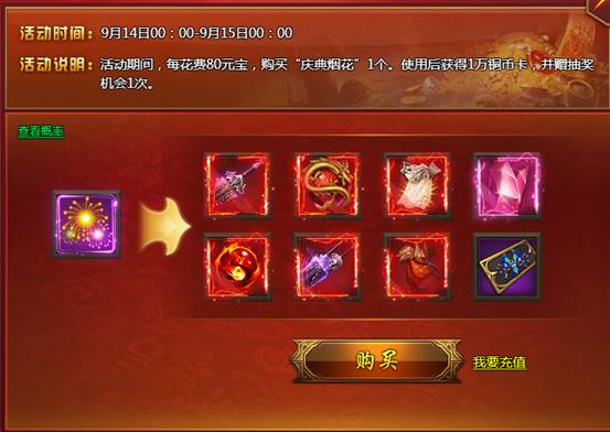 【活动内容】活动期间,花费80元宝购买活动道具“庆典烟花”1个,使用后获得1万铜币卡,并赠抽奖机会1次,抽奖后即有机会获得高级披风材料、剑鞘、高级宝石等众多豪华大礼,机会难得!