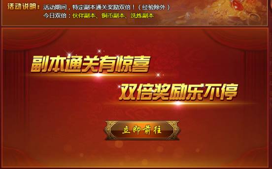 【活动内容】活动期间,特定副本通关奖励双倍!(经验除外)。