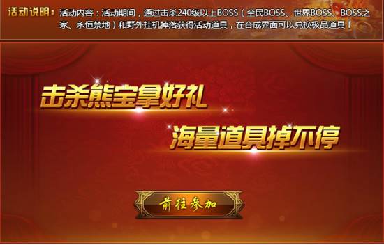 【活动内容】活动期间,每天14点、19点和22点,全民boss熊宝来袭。80级以上玩家可以前往击杀,熊宝有几率掉落活动道具、6阶蓝色戒指和专业品牌装备、披风材料、剑鞘。全民Boss掉落的道具种类根据世界等级变化。