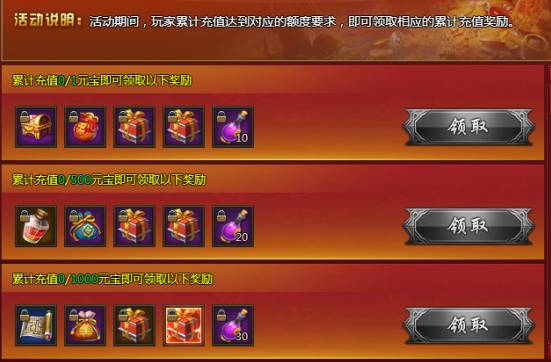 【活动内容】活动期间,玩家累计充值达到对应的额度要求,即可领取相应的累计充值奖励。