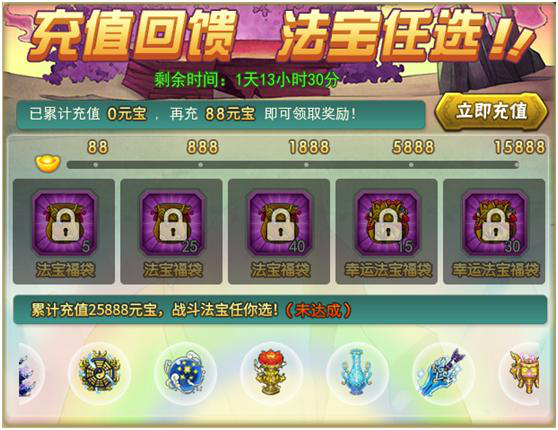 活动内容:活动期间,累计充值至指定金额即可获得福袋奖励,累计充值至25888元宝及以上可任意选择一个法宝。